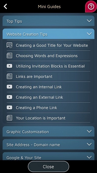 For å hjelpe deg med å bli bedre kjent med hvordan du lager et nettsted av høy kvalitet, kan du sjekke ut miniguidemenyen som har mange verdifulle tips og råd. Oppgrader bare et nettsted til et Smart- eller Pro -nettsted når du trenger de ekstra funksjonene.